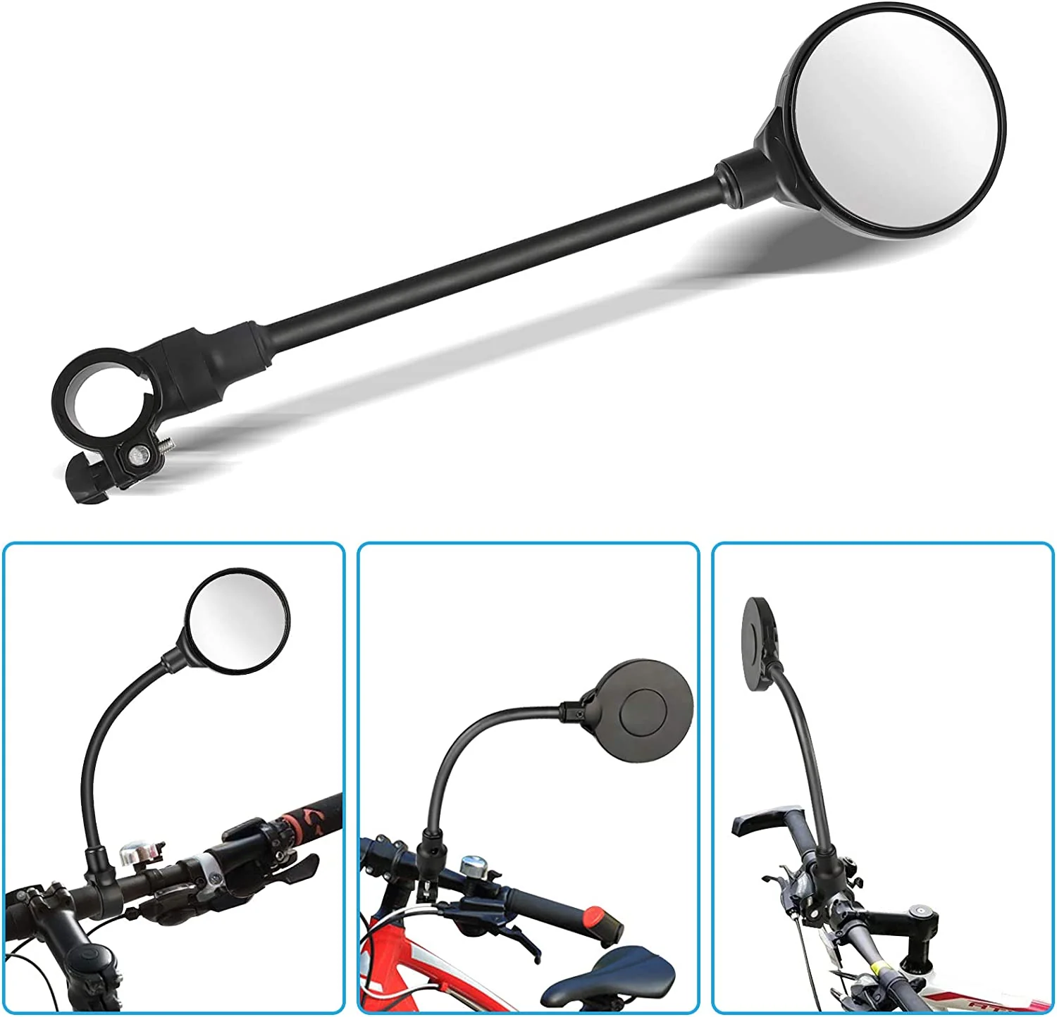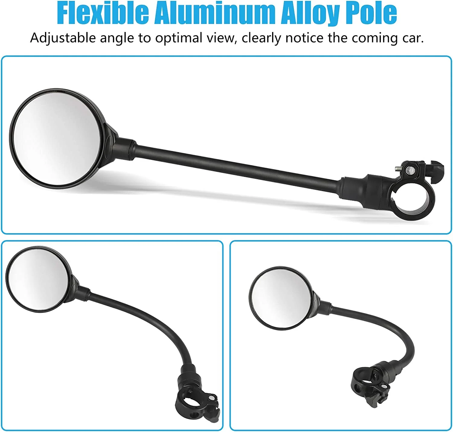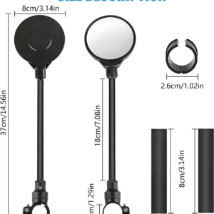- 【360-degree rotatable HD rearview mirror】The cycle mirrors come with a long arm, stable and stiff, while can be bent for adjusting; The lens can be 360° rotated to adjust the viewing angle, and allow fine-tuned by pressing on the edge up or down, even while cycling, prevents distraction and neck.